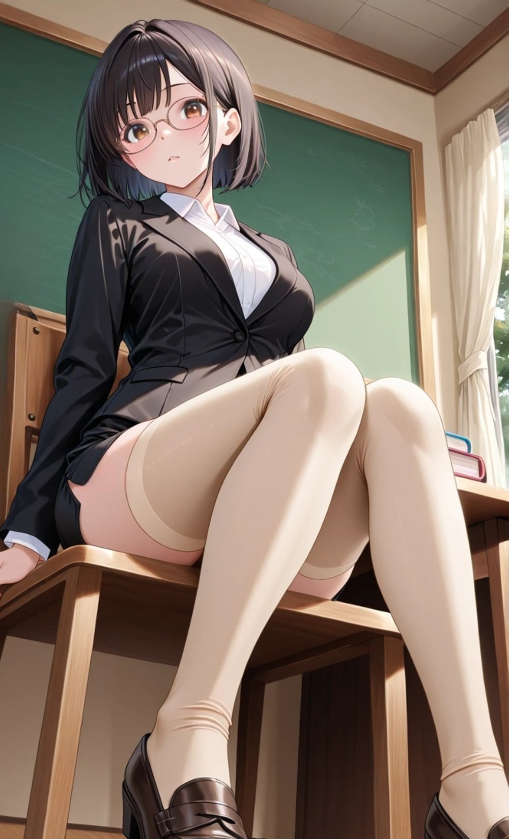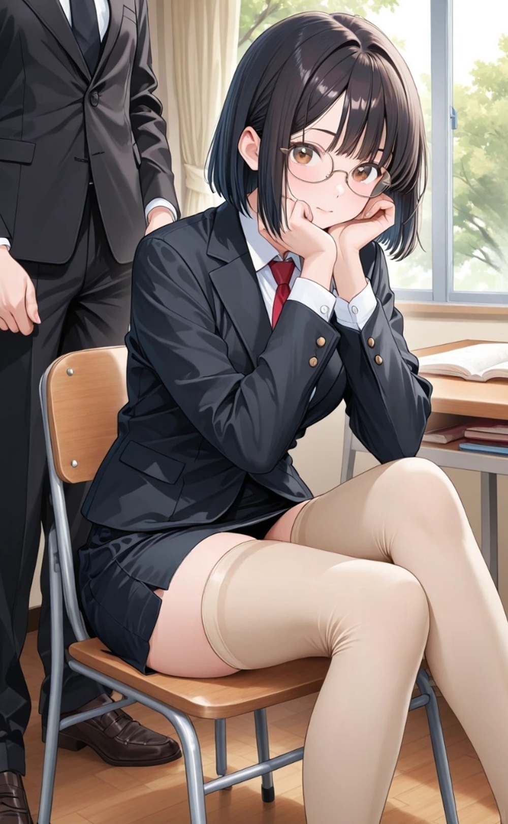 机の下で組まれた脚。パンスト越しに伝わる体温と、スカートの裾から覗く「絶対領域」。
