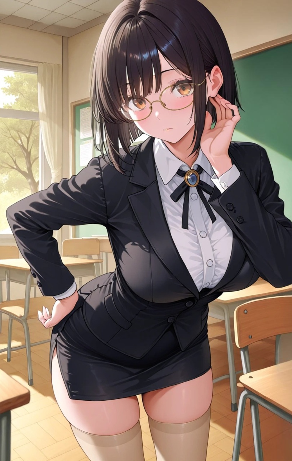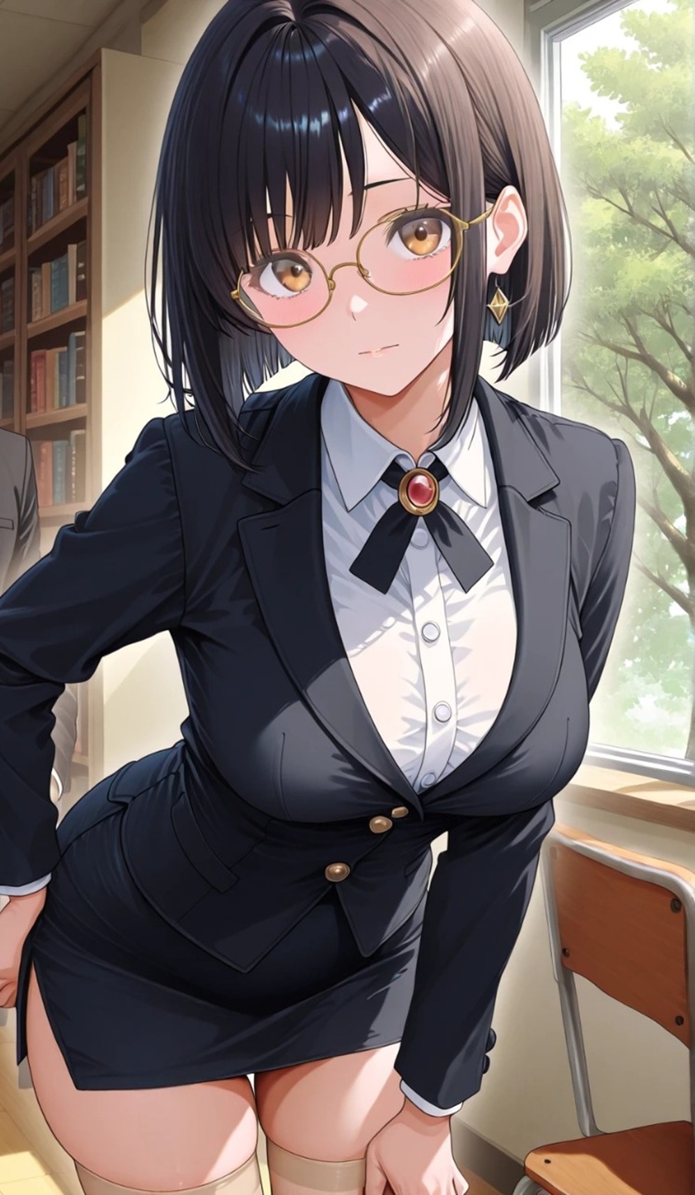 いつもは真面目なタイトスカートに眼鏡の先生。でも、重い資料を取ろうと背伸びをした瞬間、白シャツのボタンが弾け、黒いレースの縁がチラリと覗いた。