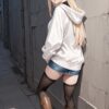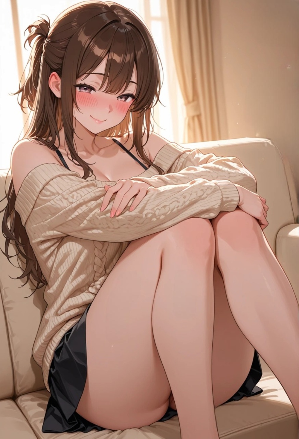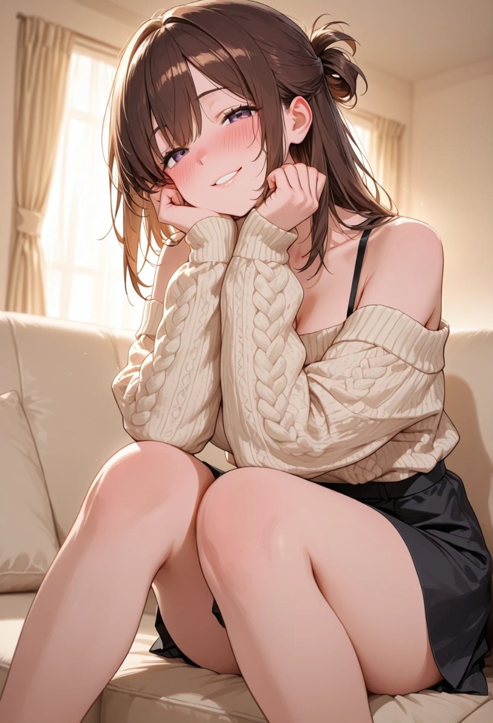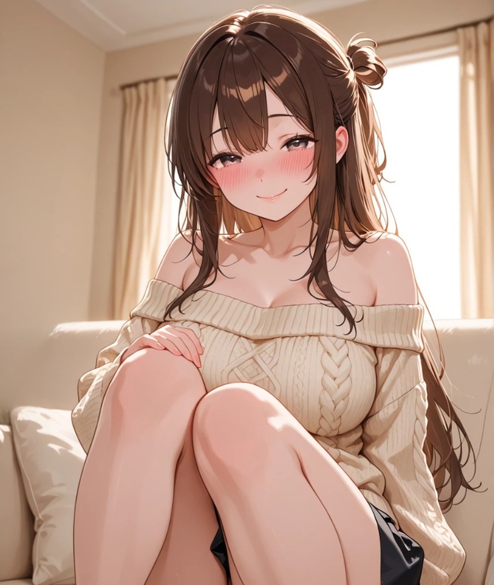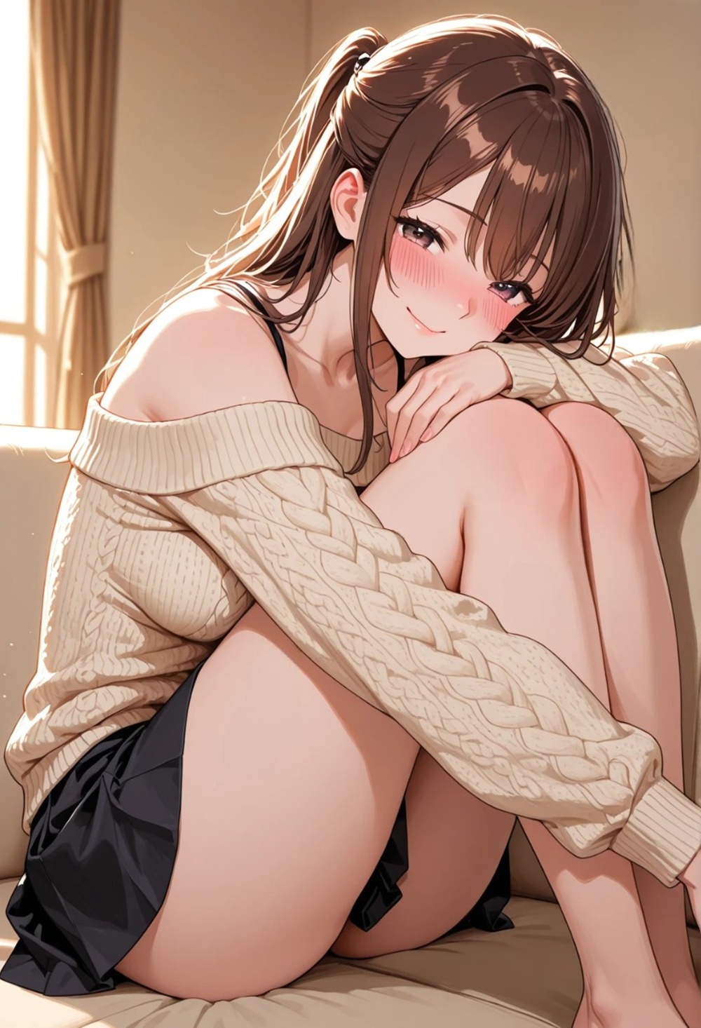 オフショルダーのニットが肩から滑り落ち、覗いた白い肌が夕闇の中で妖しく光る。