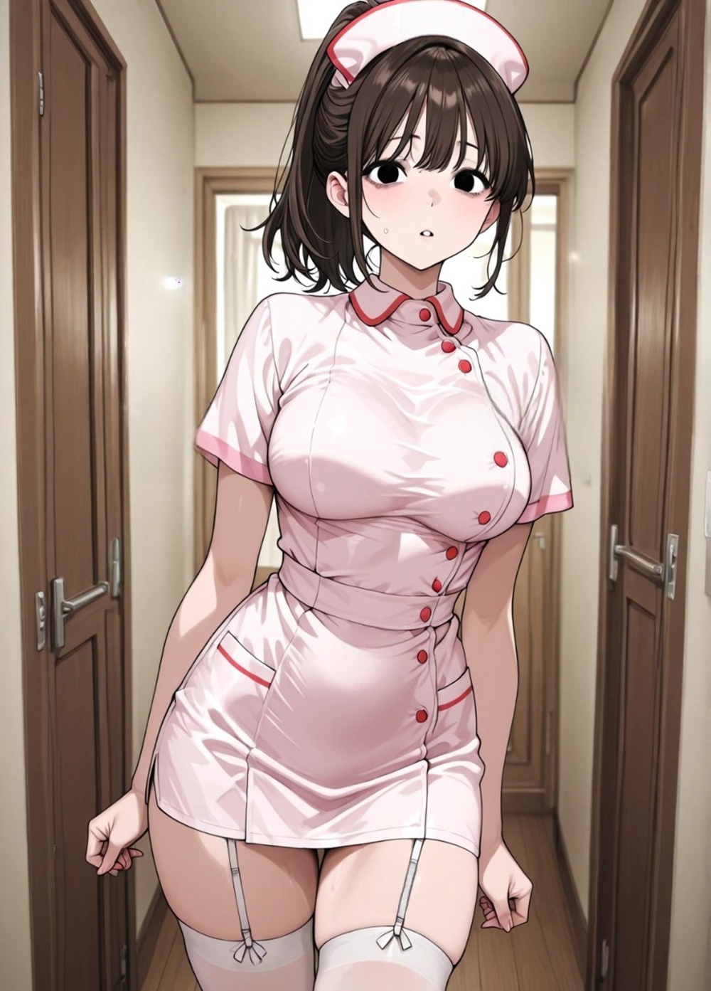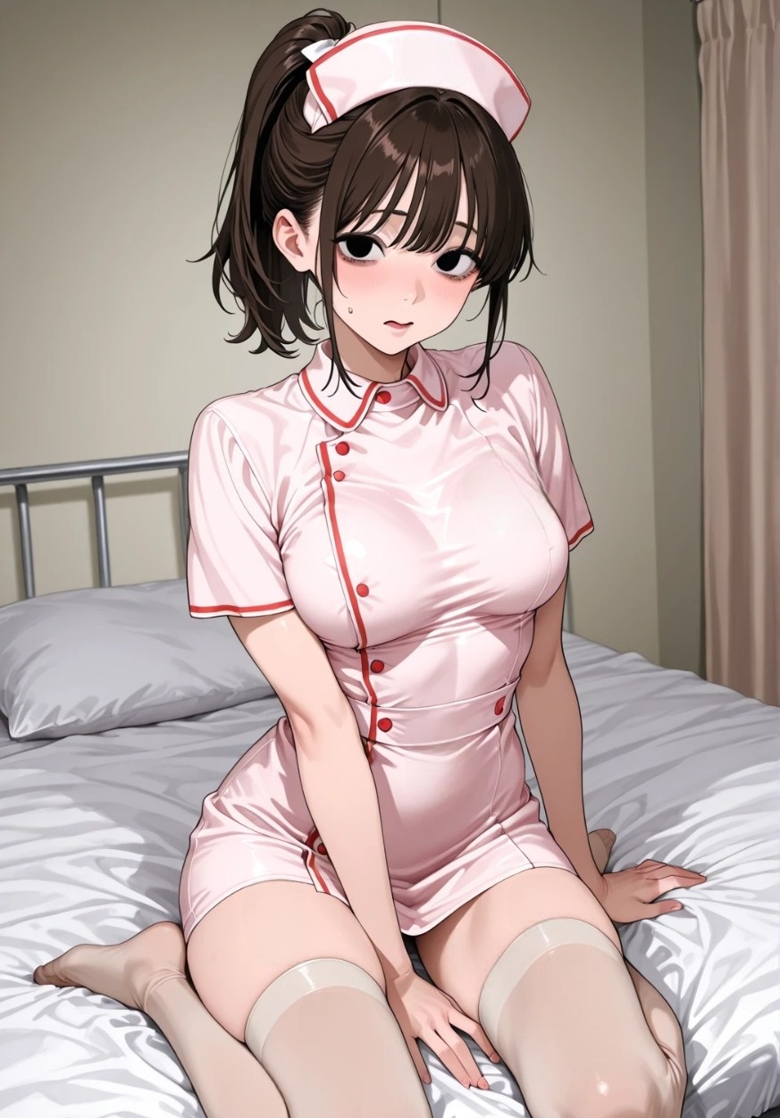 そして、清潔なナース服のスカートをゆっくりと、パンティが露わになるまで自らの手で捲り上げて見せつける。
