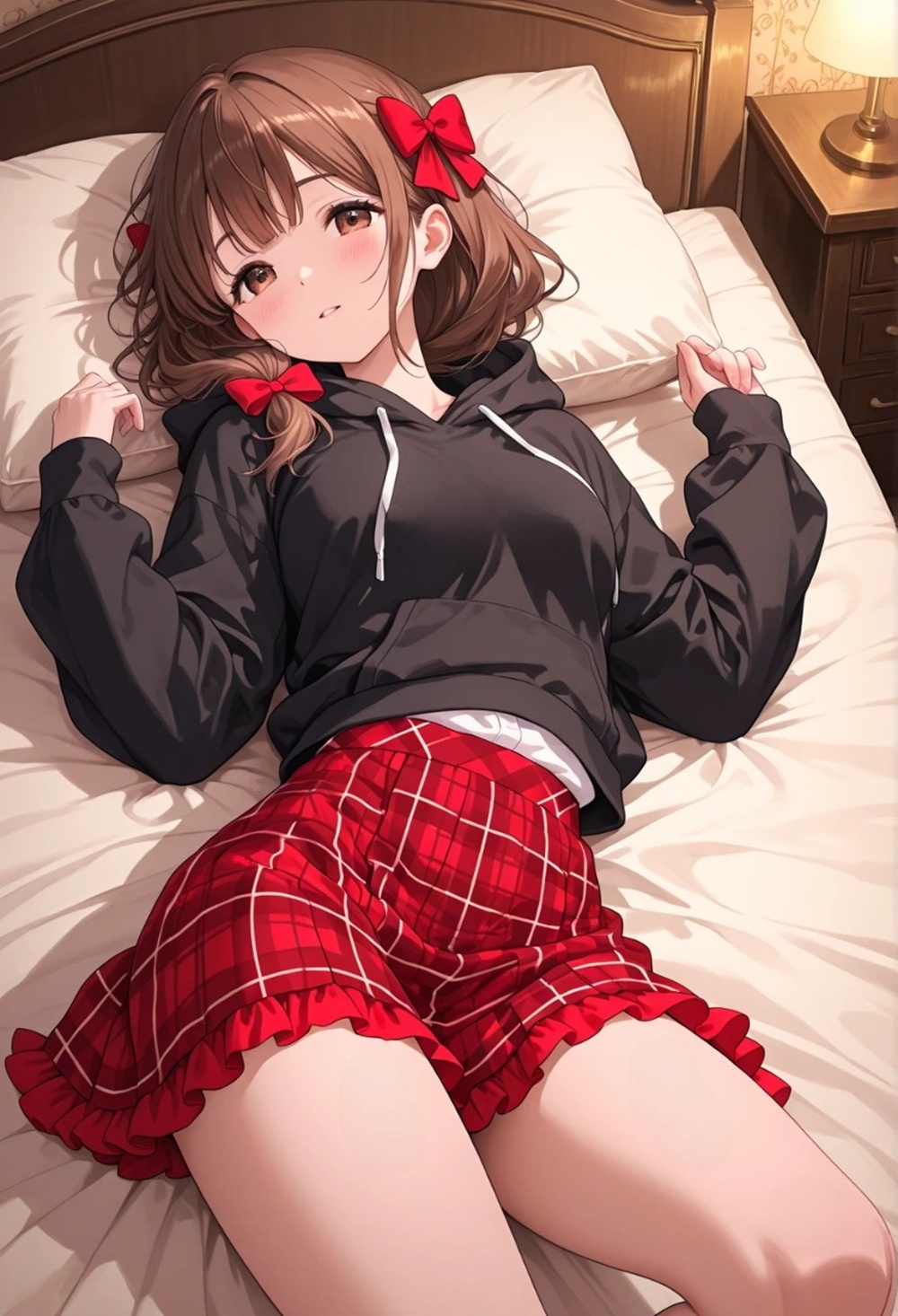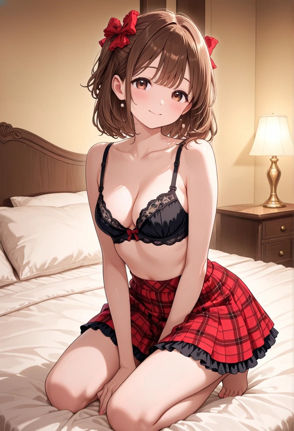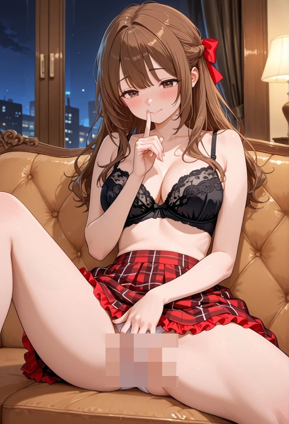 黒いレースが、柔らかな白い肌を締め付けるように縁取っている。そのあまりに強烈なギャップに、僕は息を呑んだ。チェックのスカートを揺らしながら、四つん這いでシーツの上を這い寄ってくる君の瞳は、もう「みんなのアイドル」のそれじゃない。