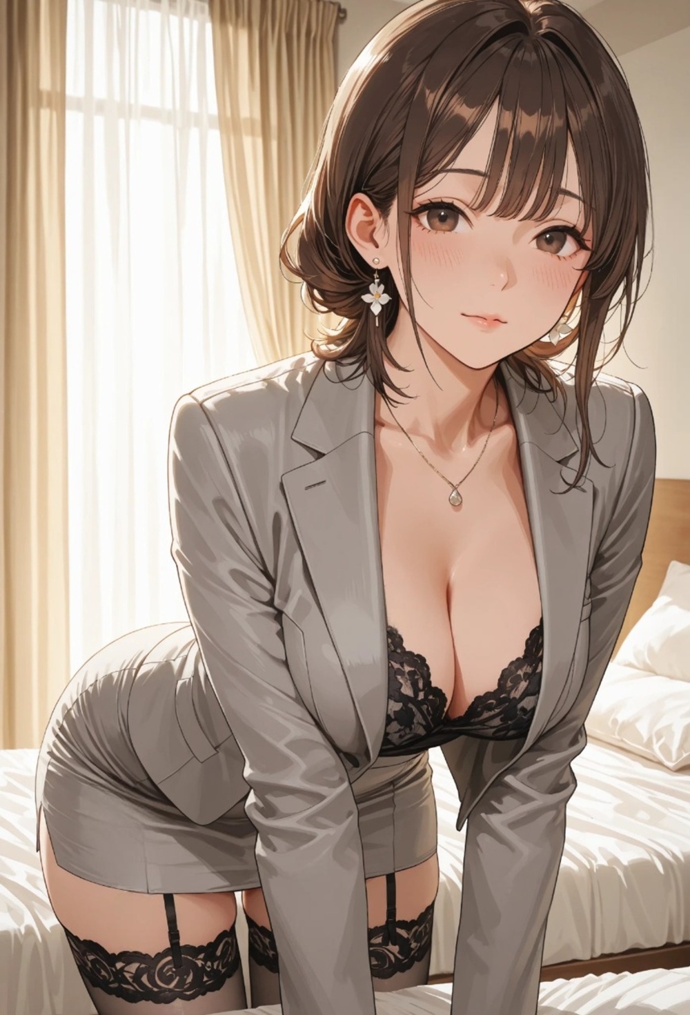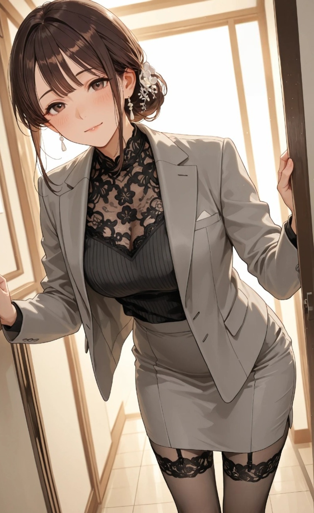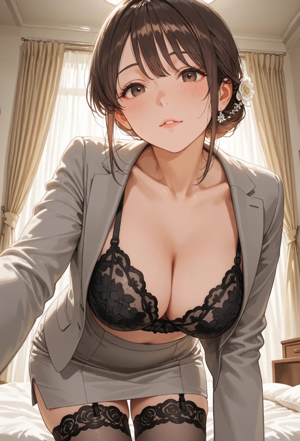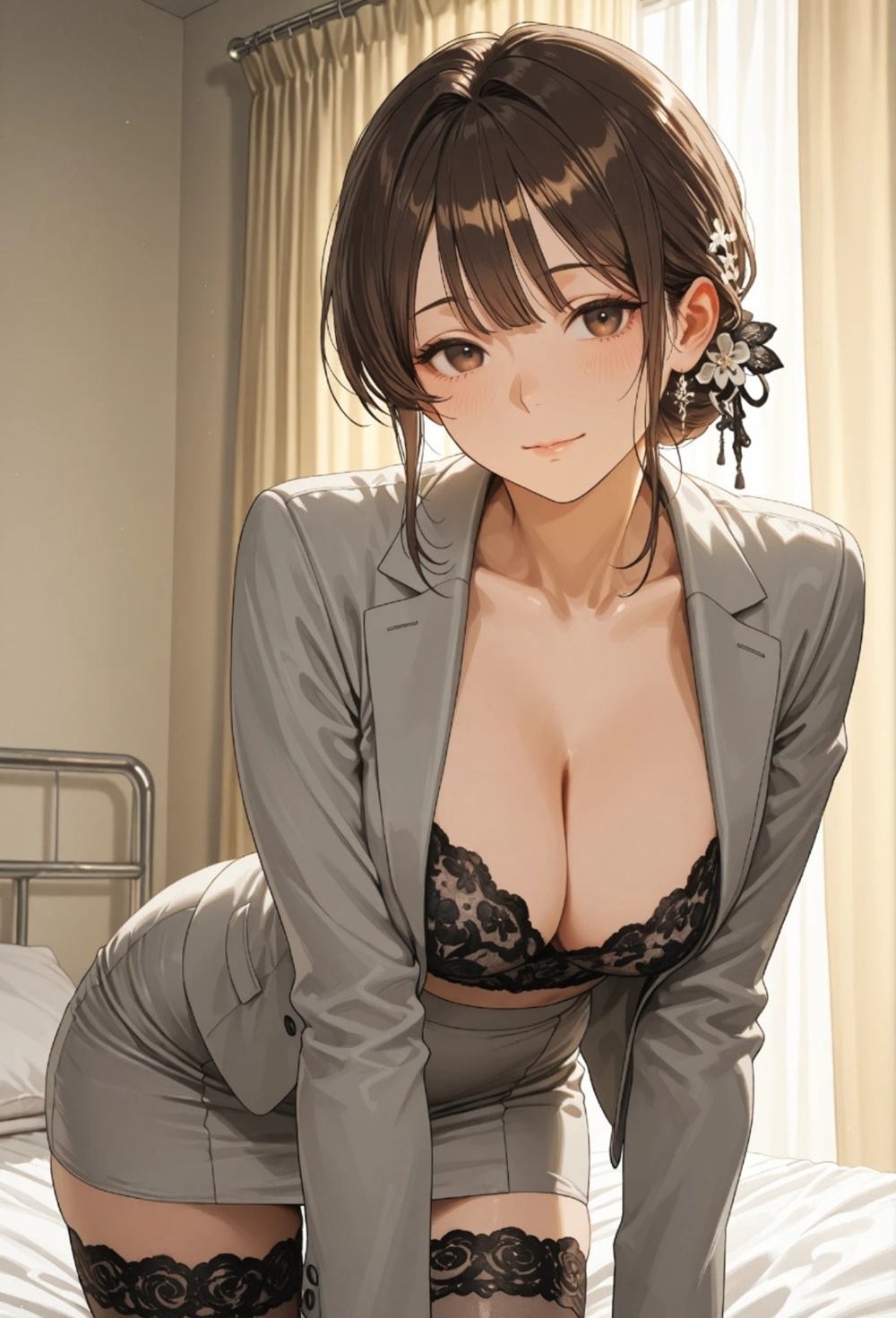 無機質な病室の空気を一変させたのは、彼女が纏う微かな香水の香りと、ストッキングが擦れる密やかな音だった。見舞いに訪れた部下の彼女は、僕の視線がその膝元、ガーターレースの縁に吸い寄せられていることに気づくと、挑発するようにゆっくりと脚を組み替えた。