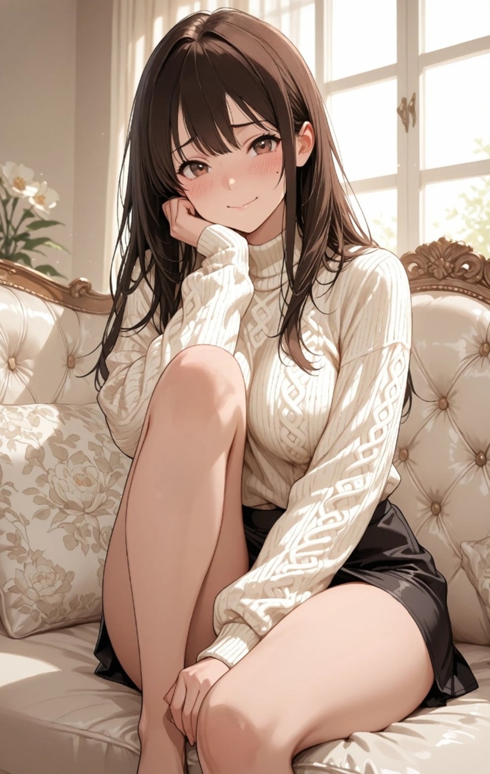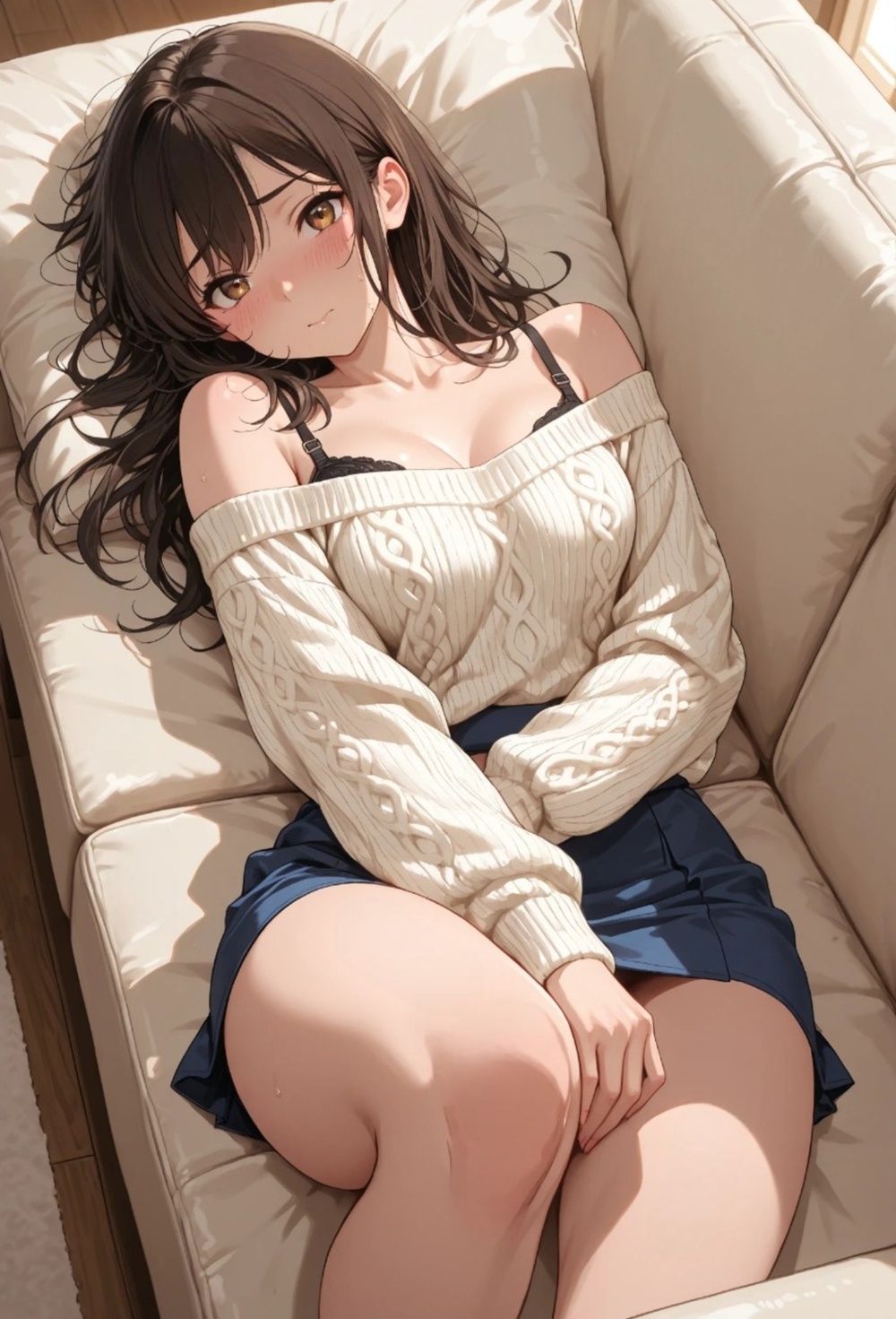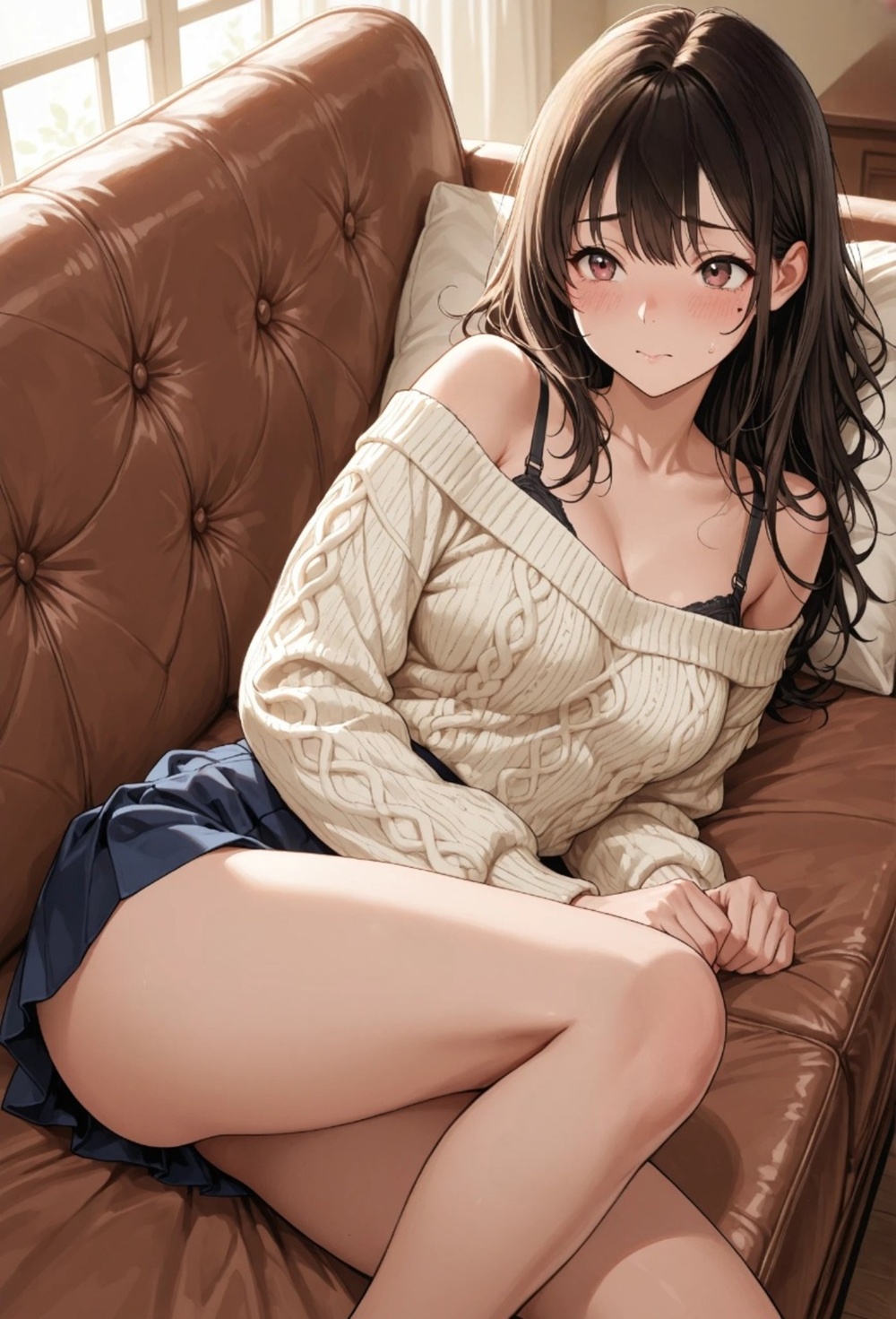 A quiet Sunday afternoon, the scent of her perfume mixed with the nostalgia of a love that should have ended. Now she belongs to someone else, yet the way she looks at me in that loosened sweater tells a different story—one of neglect, desire, and the forbidden warmth she only finds in this room. The rustle of lace against the sofa is the only sound in our secret sanctuary.
