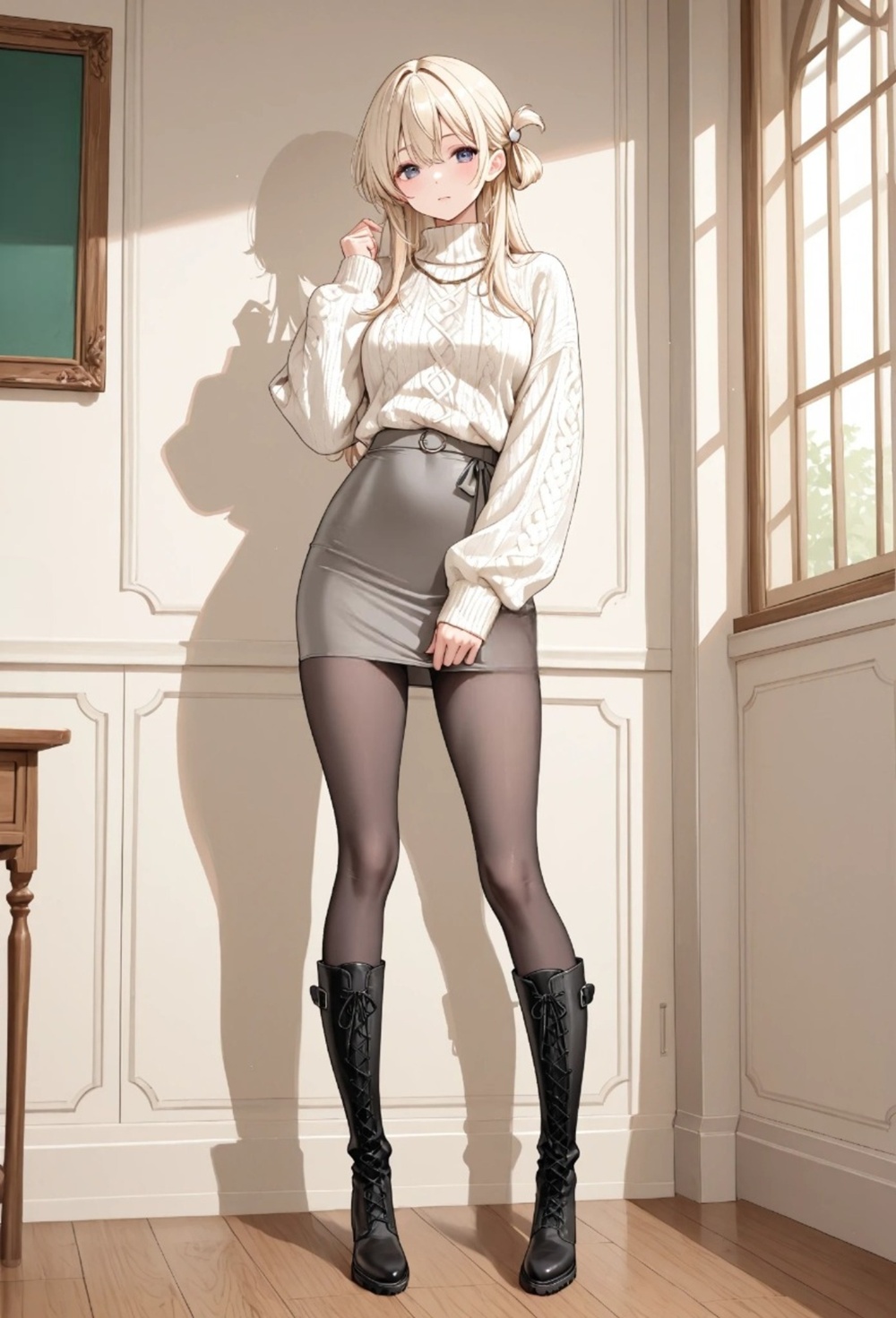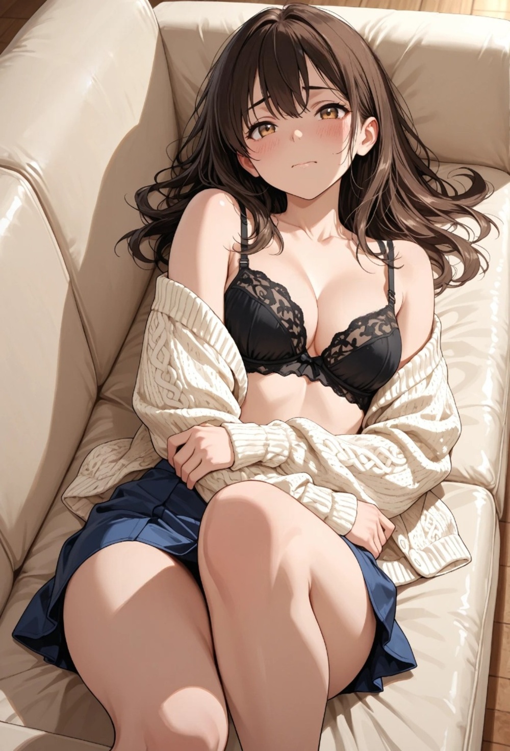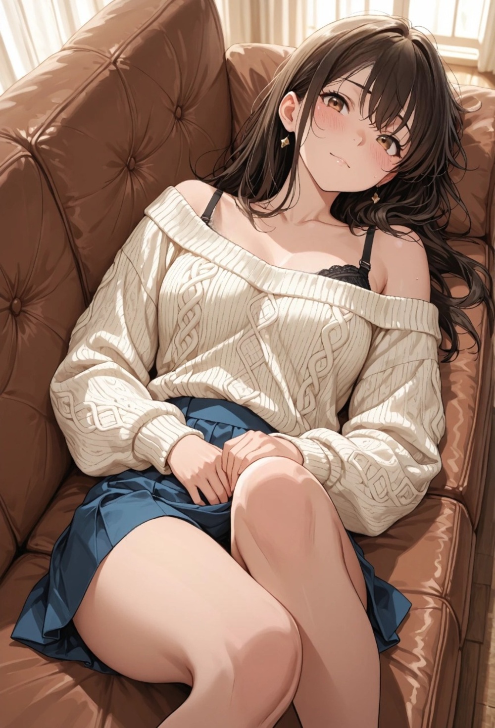 A quiet Sunday afternoon, the scent of her perfume mixed with the nostalgia of a love that should have ended. Now she belongs to someone else, yet the way she looks at me in that loosened sweater tells a different story—one of neglect, desire, and the forbidden warmth she only finds in this room. The rustle of lace against the sofa is the only sound in our secret sanctuary.