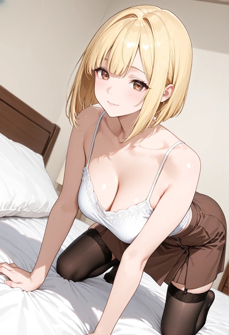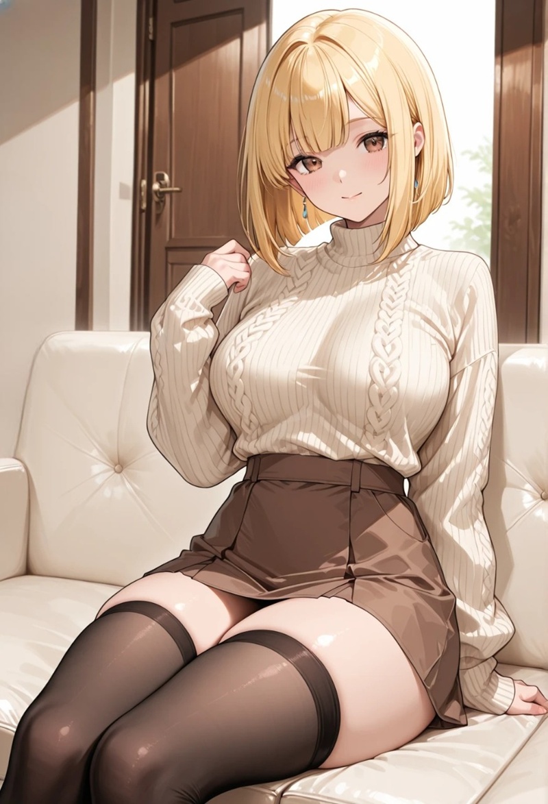 クリーム色のニットに、スカート、そして太ももがなんとも魅力的だ。