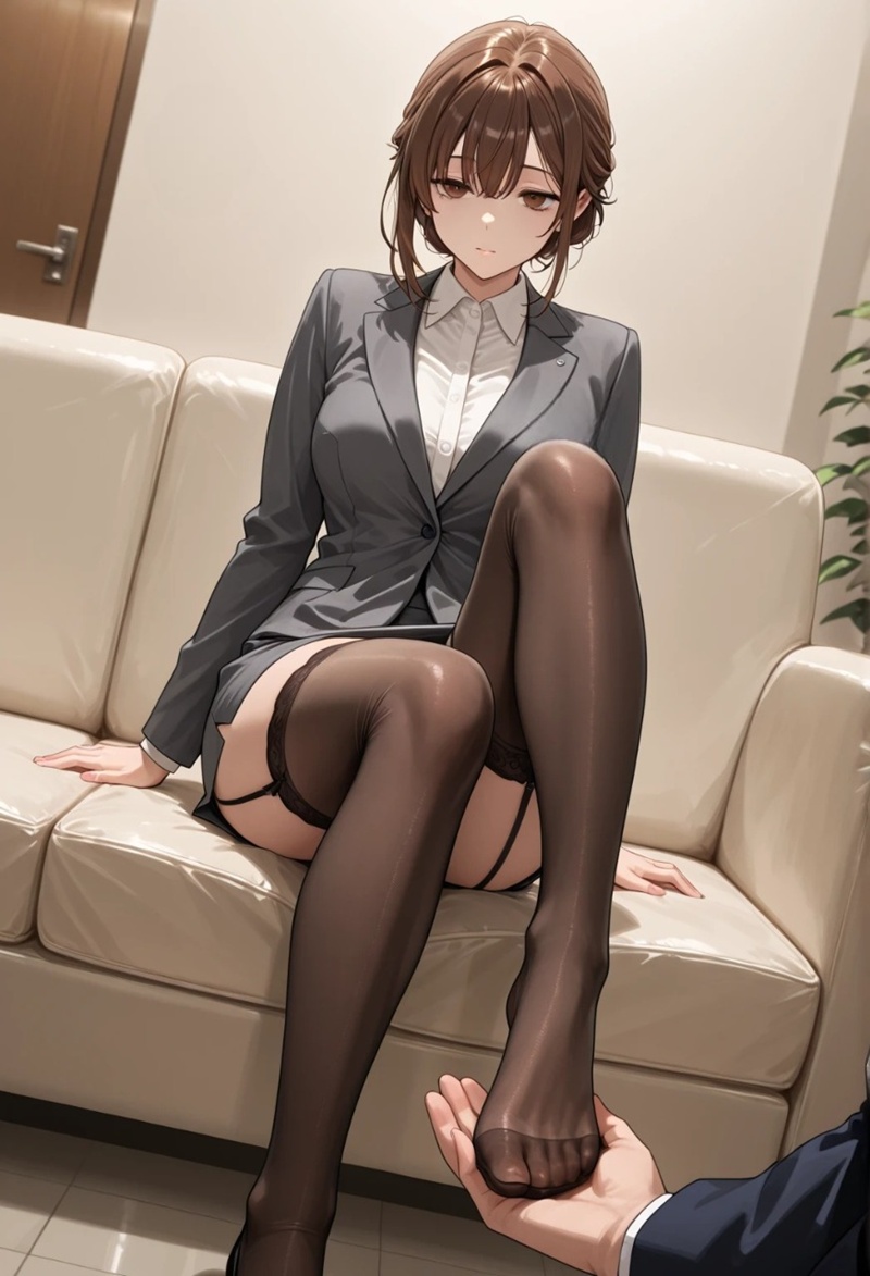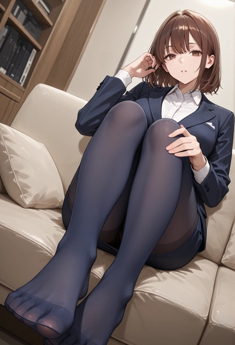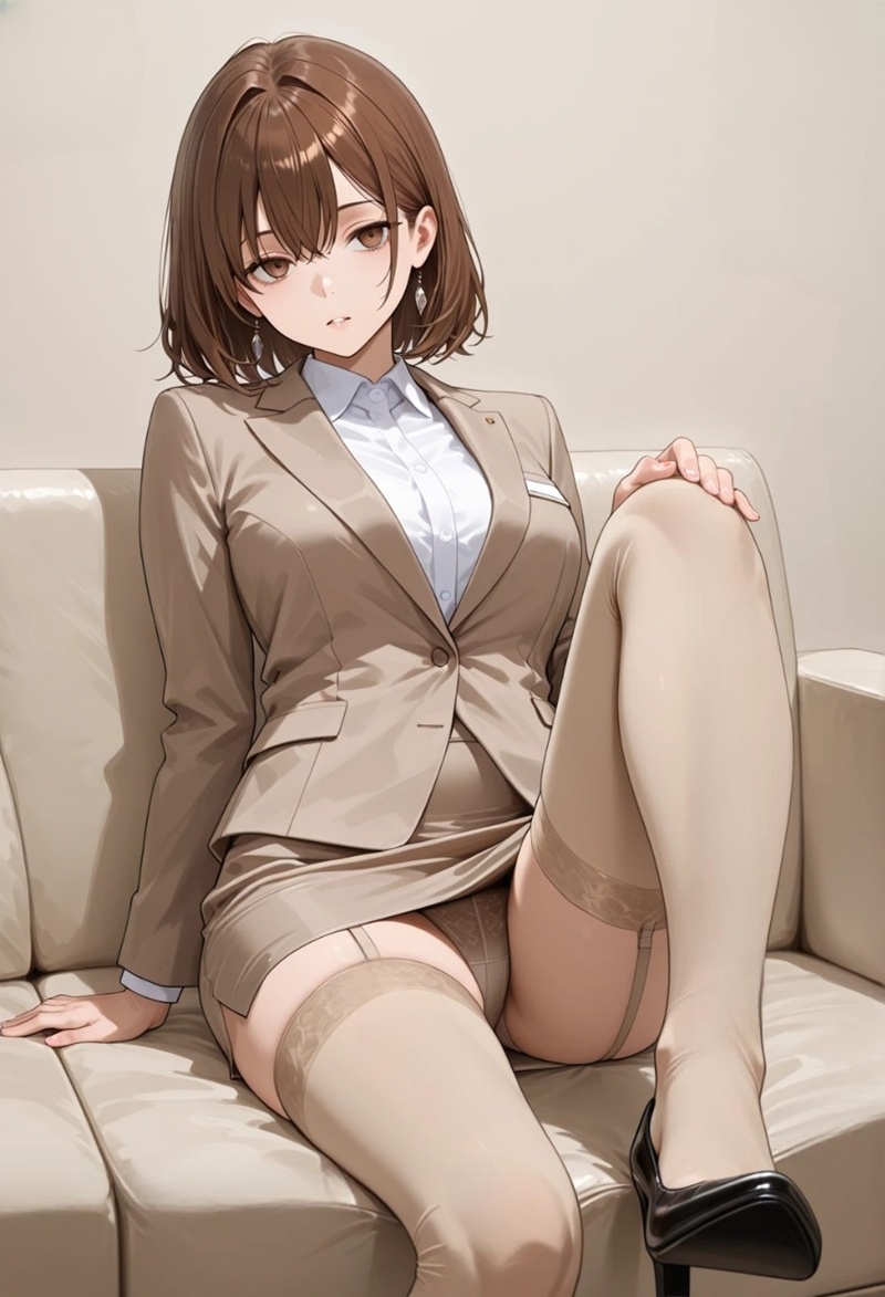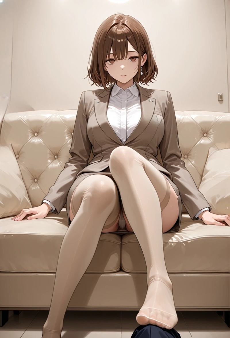 きちんとしたOLスーツに身を包んでいるはずなのに、なぜかストッキングだけが印象に残る。