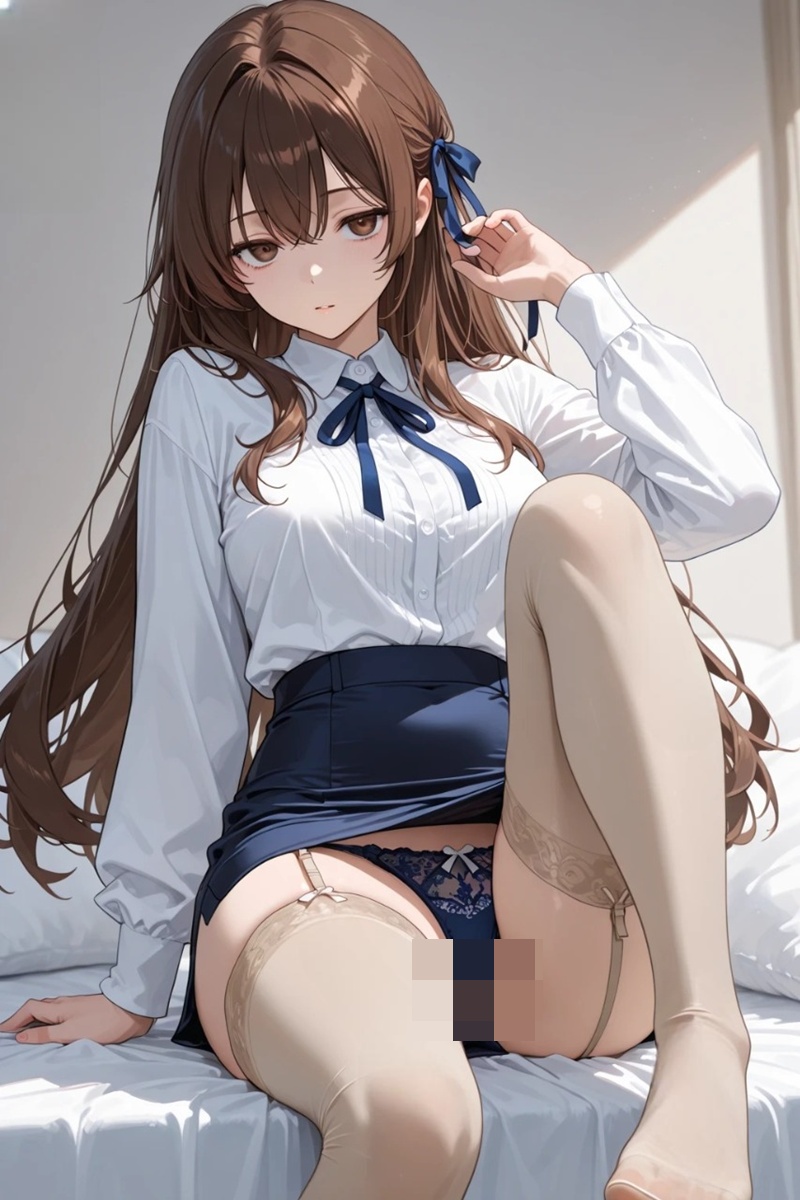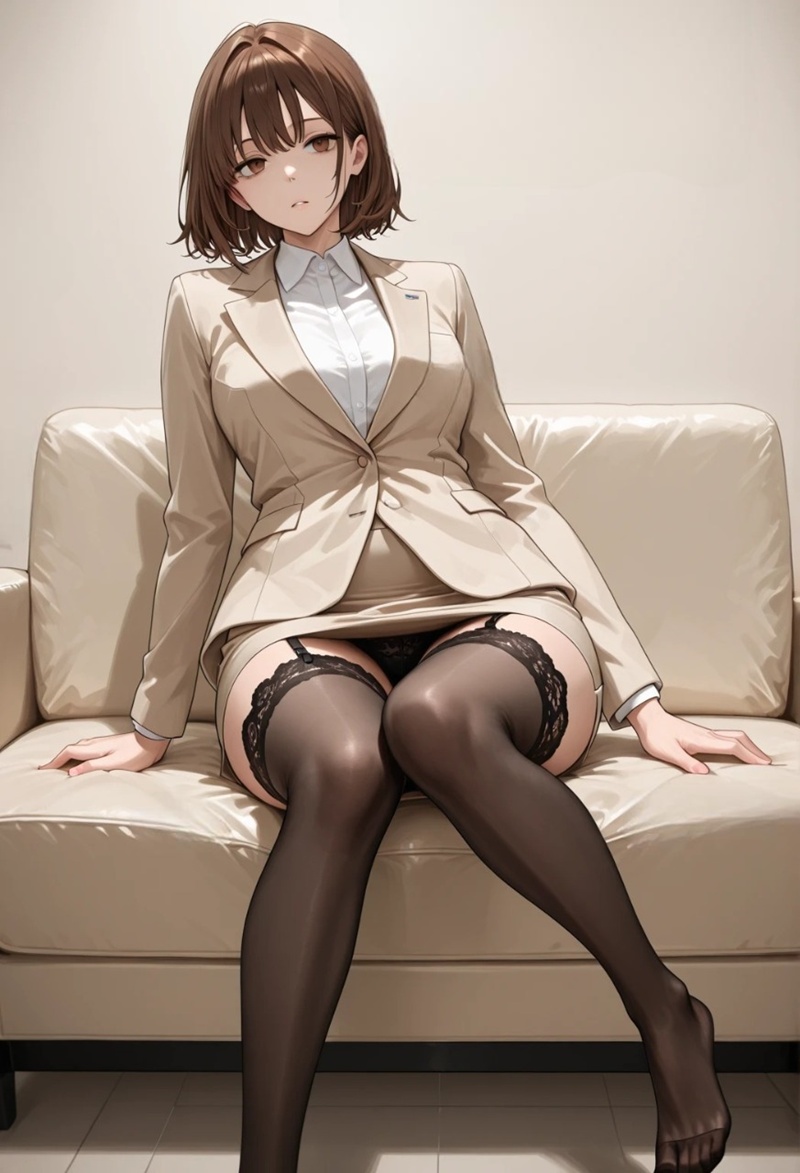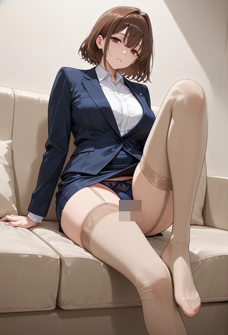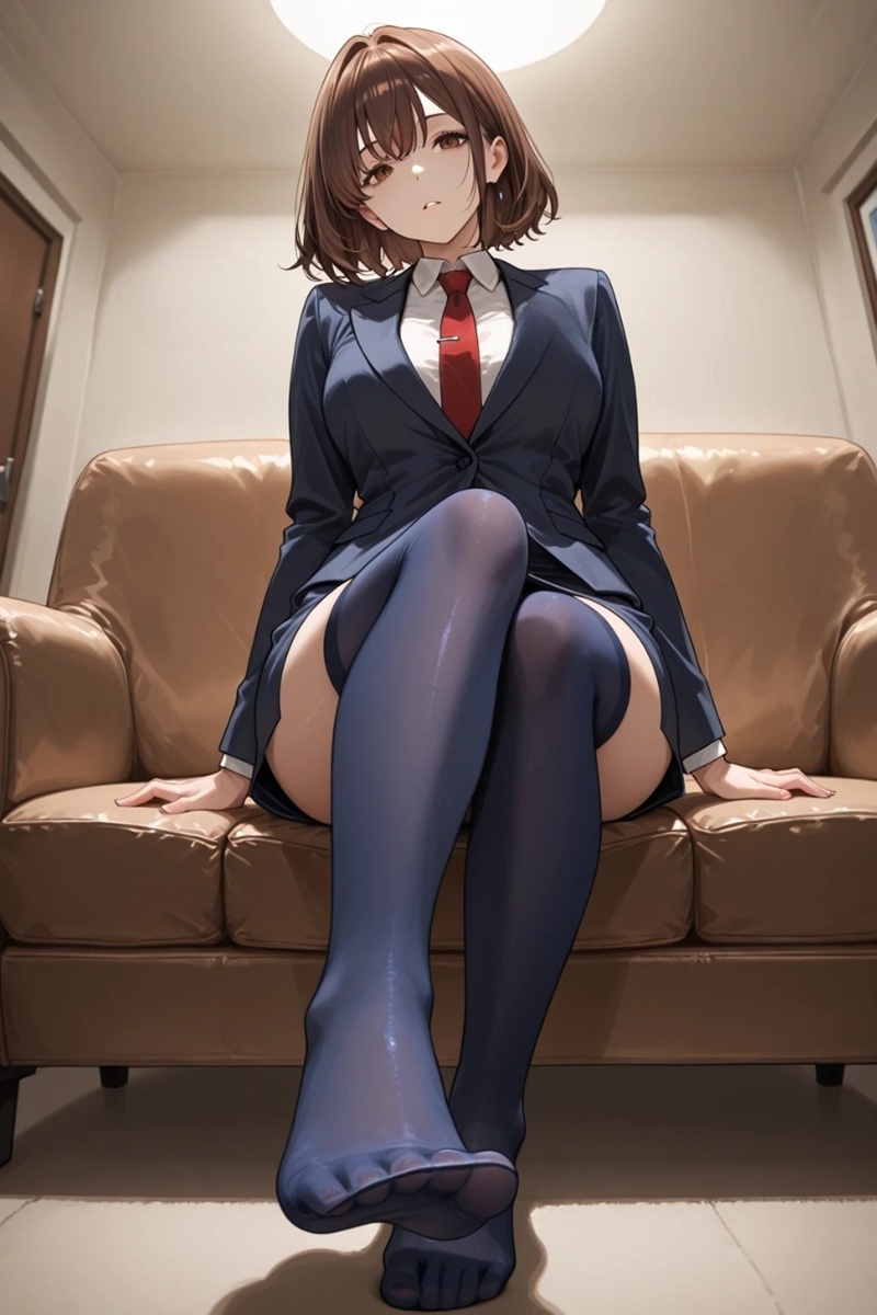 きちんとしたOLスーツに身を包んでいるはずなのに、なぜかストッキングだけが印象に残る。