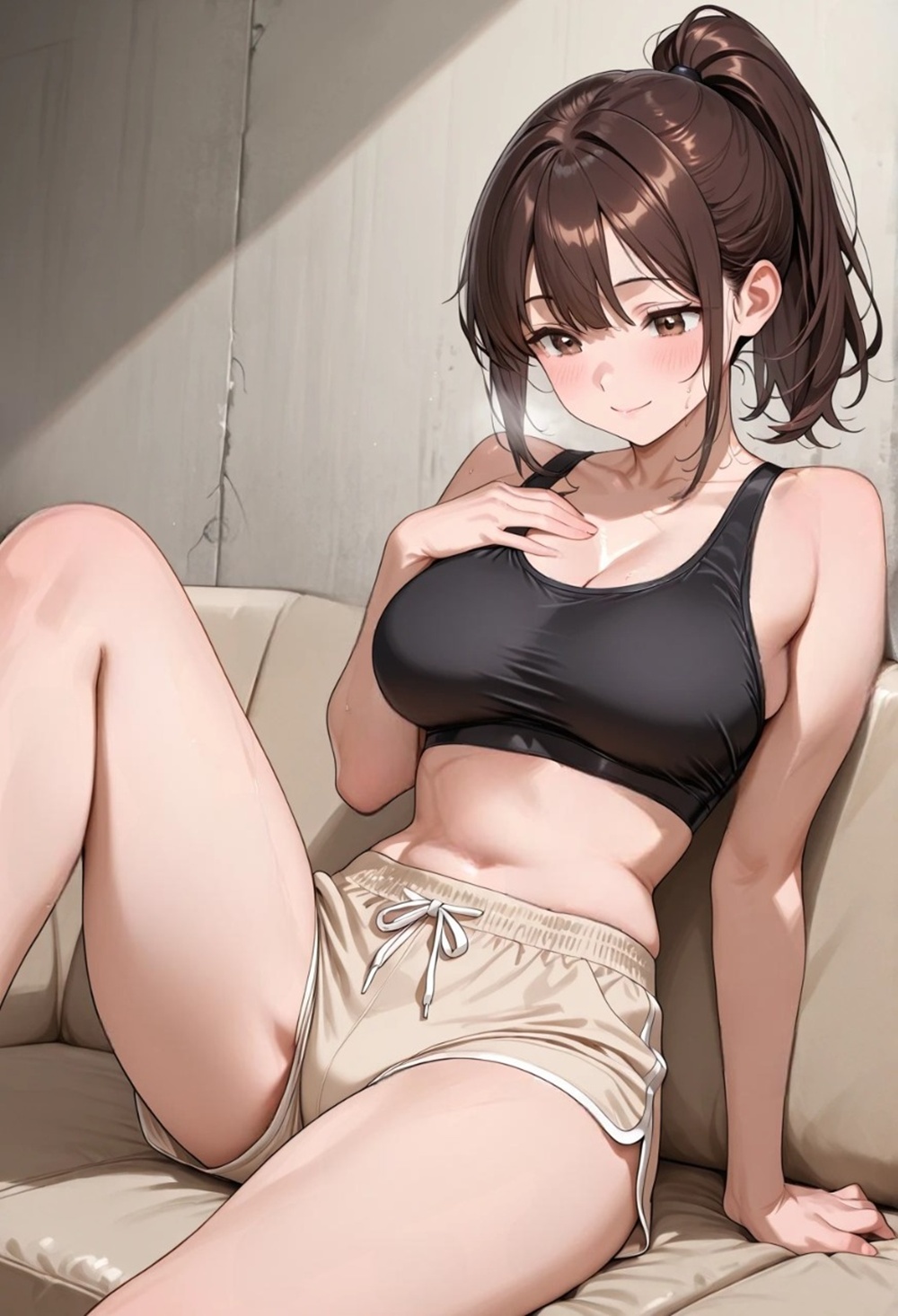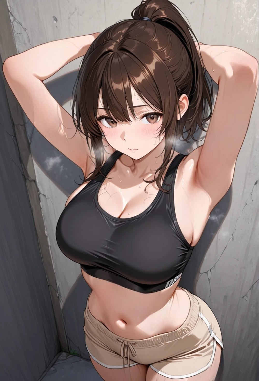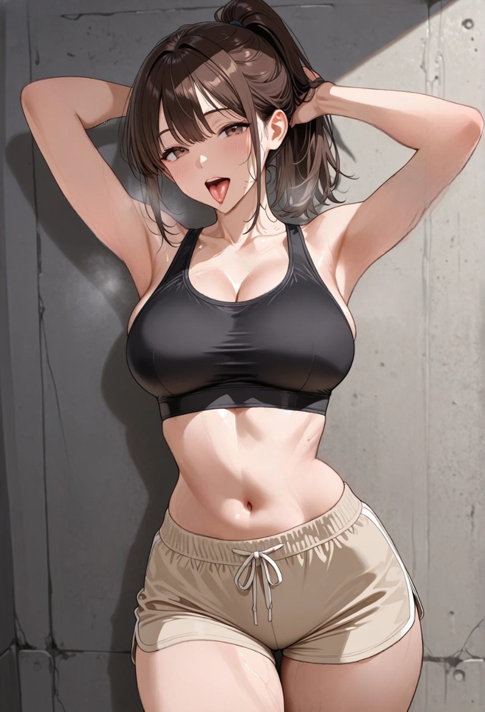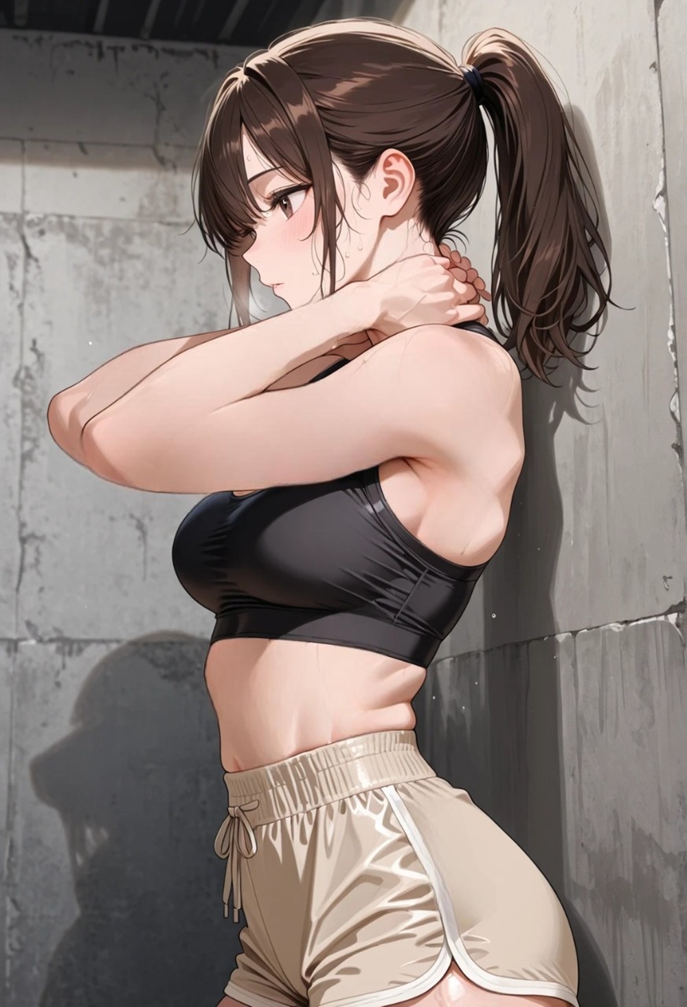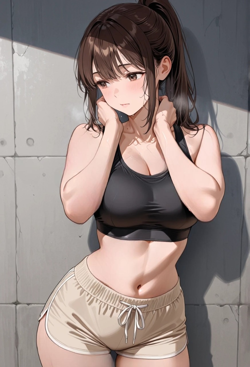 彼女はタオルで首元の汗を押さえながら、壁にもたれかかる。